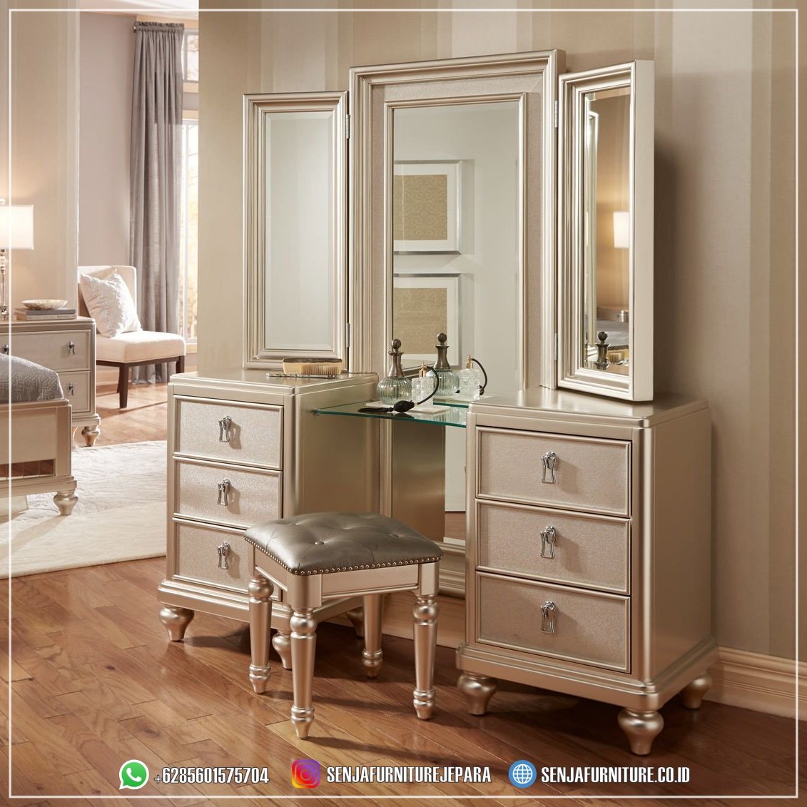 Kami mengundang Anda untuk merasakan kemewahan dan pesona dari Meja Rias Mewah kami yang mengagumkan. Tiap sentuhan, tiap detailnya disusun dengan keanggunan yang tak tertandingi, menciptakan suasana yang mewah dan menginspirasi di dalam ruang tidur Anda. Jadikanlah momen berdandan Anda menjadi istimewa dengan meja rias ini sebagai teman setia. Dari pagi hingga malam, nikmatilah keindahan yang tak terlupakan dari meja rias klasik kami, dan hadirkan kesempurnaan dalam setiap detiknya.